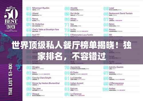 在世界各地,有一些独特的私人餐厅以其卓越的服务、精致的菜品和无可比拟的豪华氛围赢得了极高的声誉,这些餐厅往往是美食和奢华的完美结合,为顾客带来无与伦比的美食体验,以下是全球顶级的私人餐厅排名,让我们一起领略这些美食殿堂的魅力和风采。